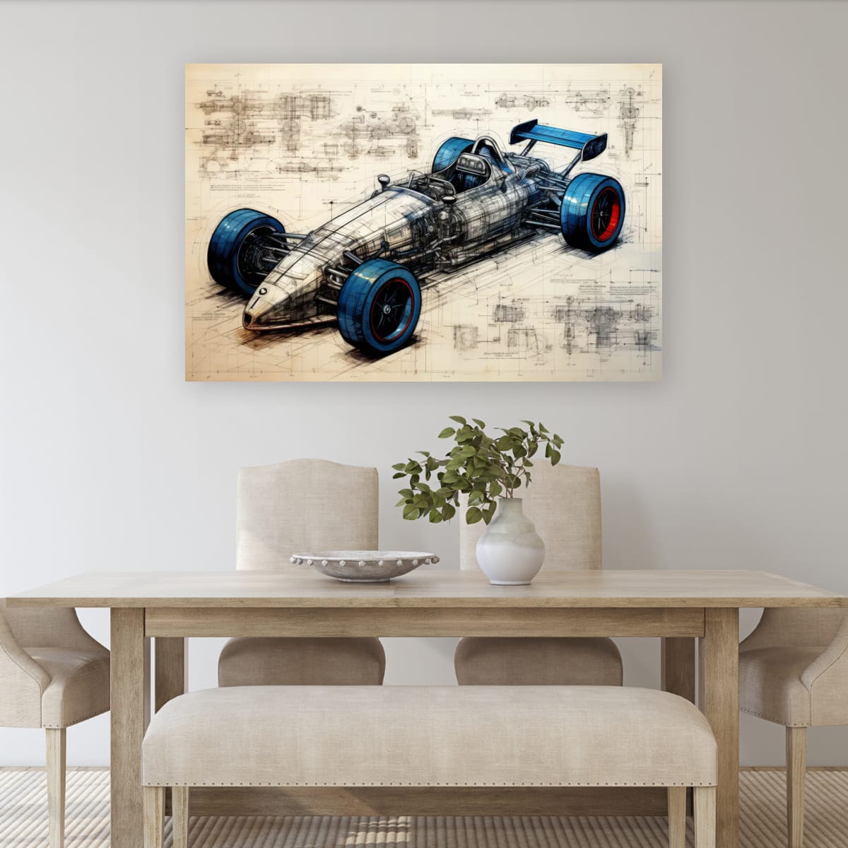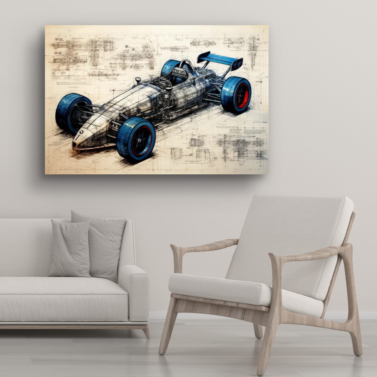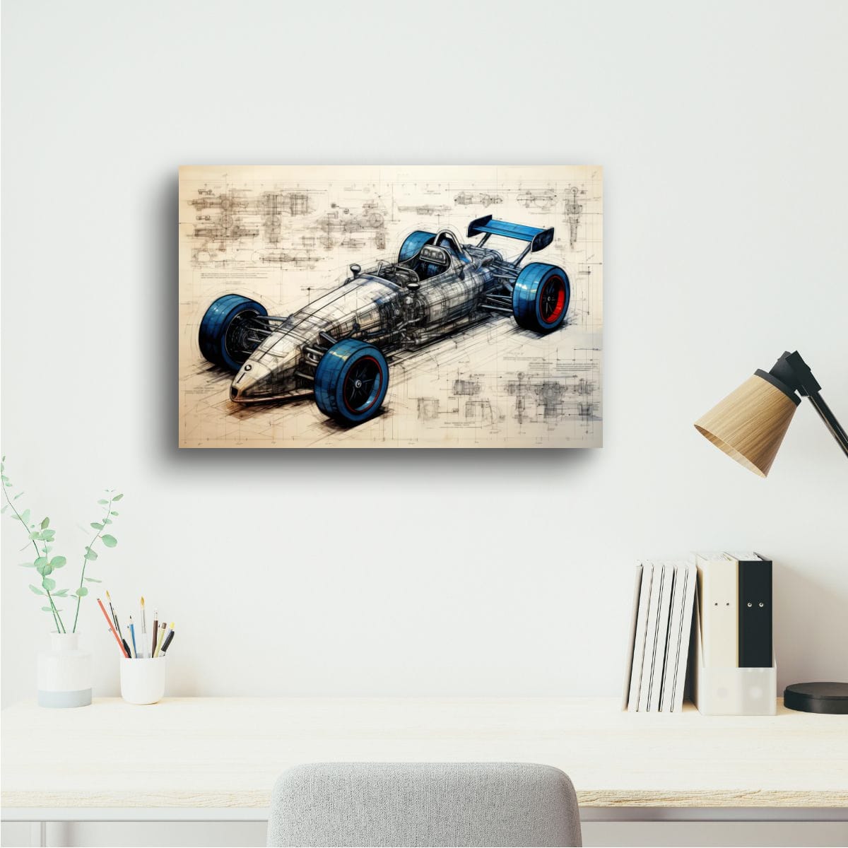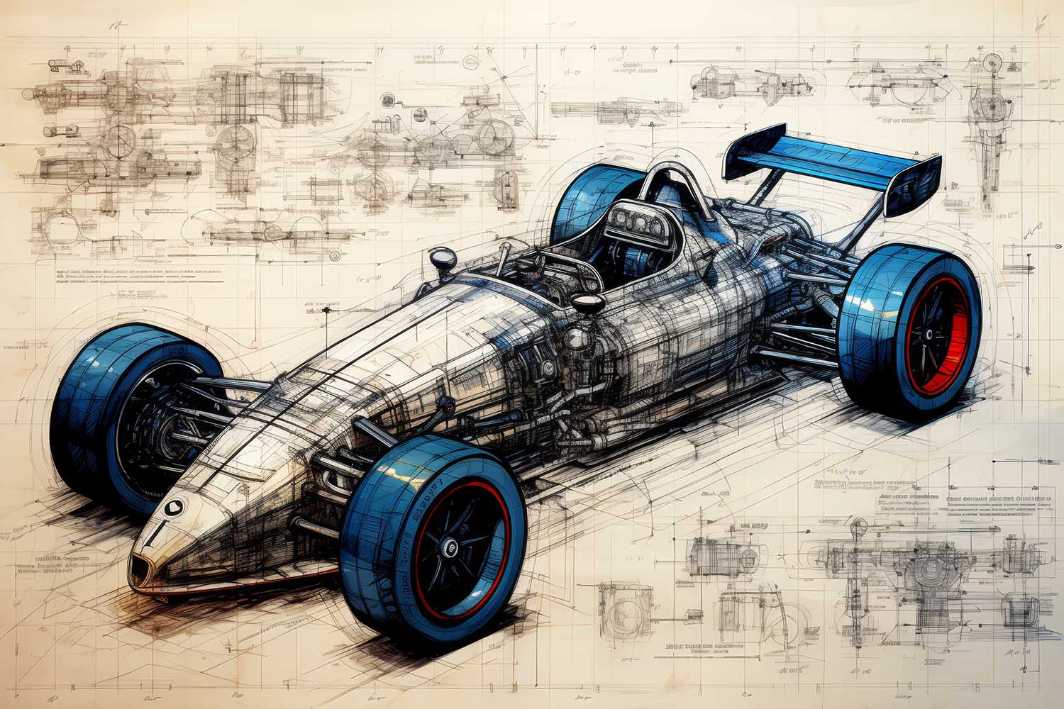 Designed for Speed presents a detailed vision of a racing car, blending technical precision with artistic design. The piece exhibits a striking balance between mechanical complexity and sleek form, highlighted by vivid blue and red accents on the tires. Intricate schematic lines and annotations weave through the composition, emphasizing the engineering behind the speed. This artwork makes a compelling addition for those drawn to innovation and motion within their space.