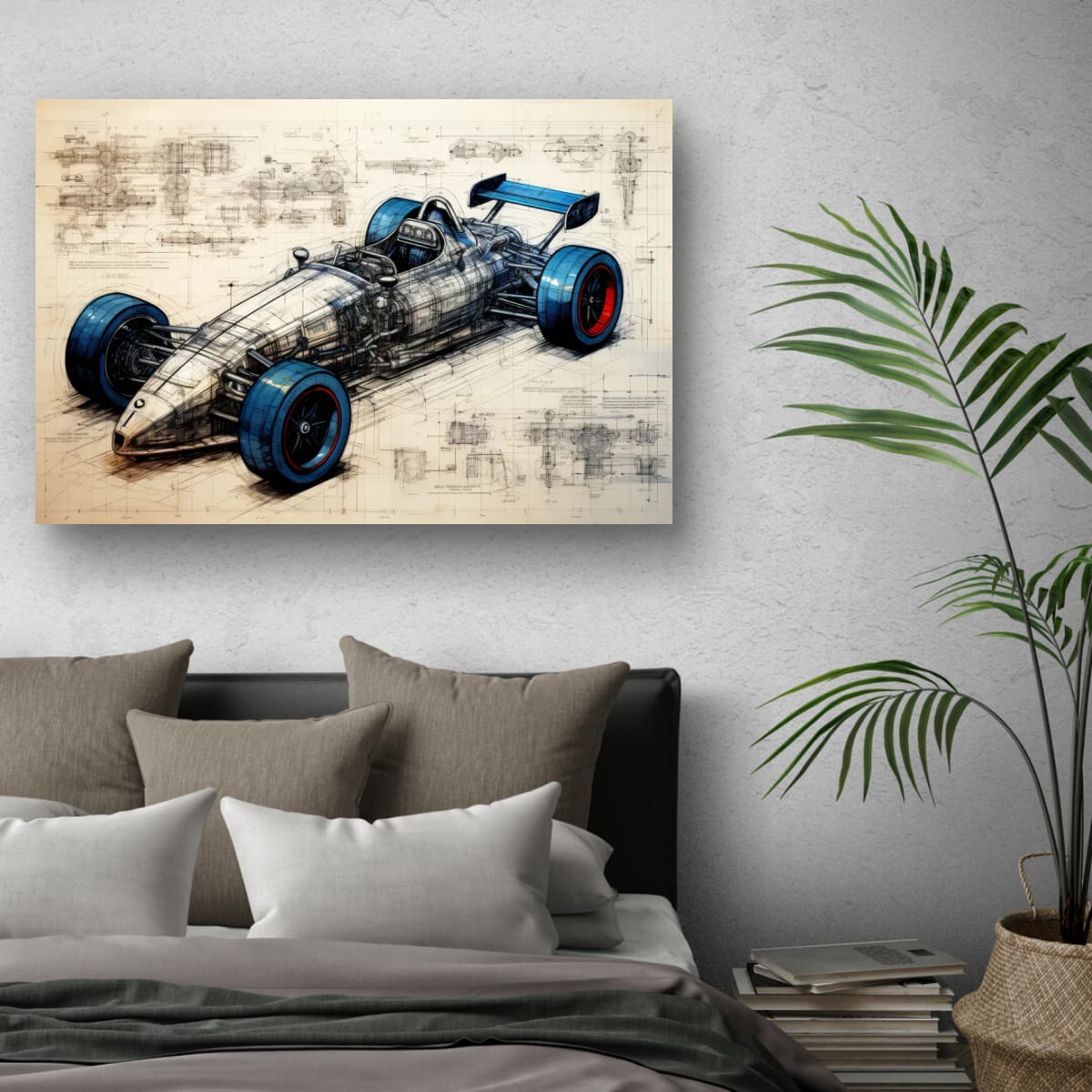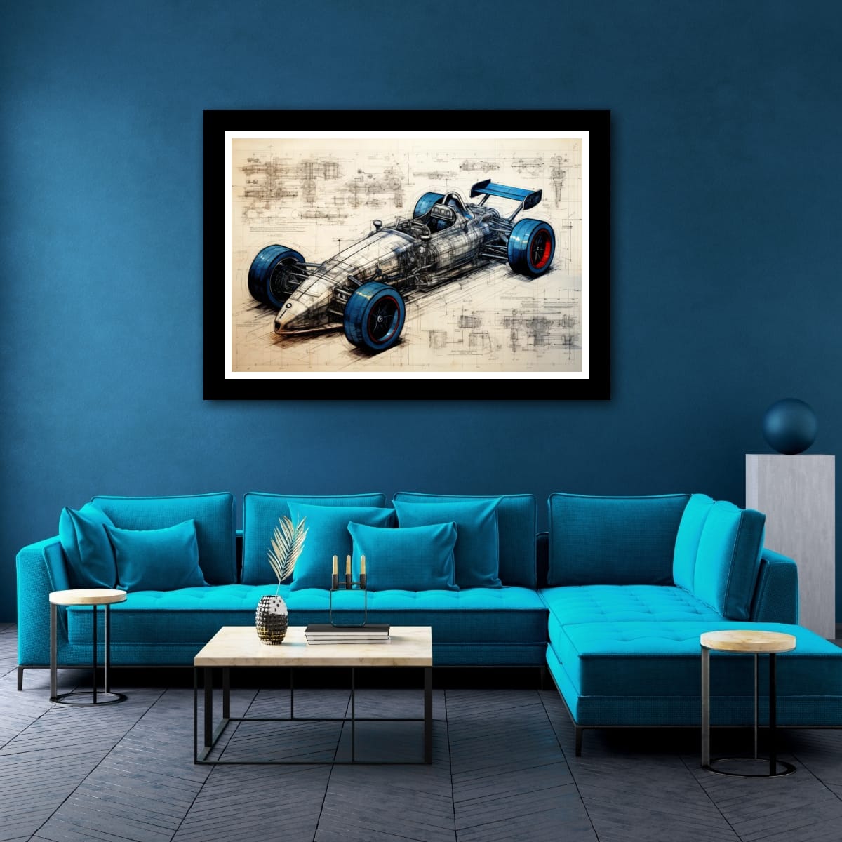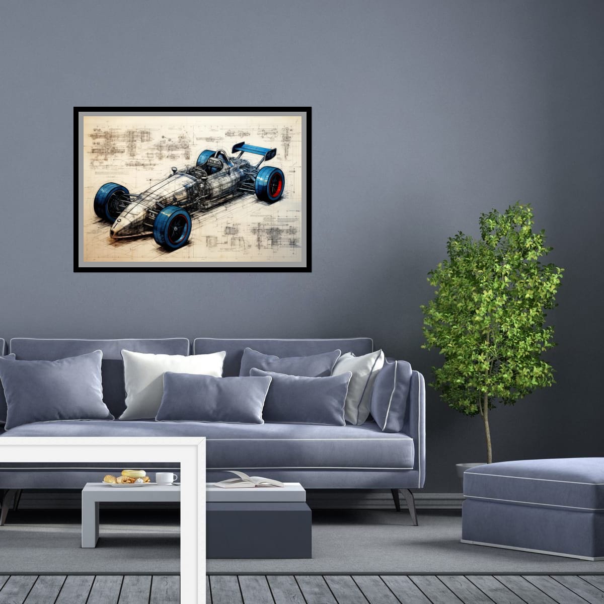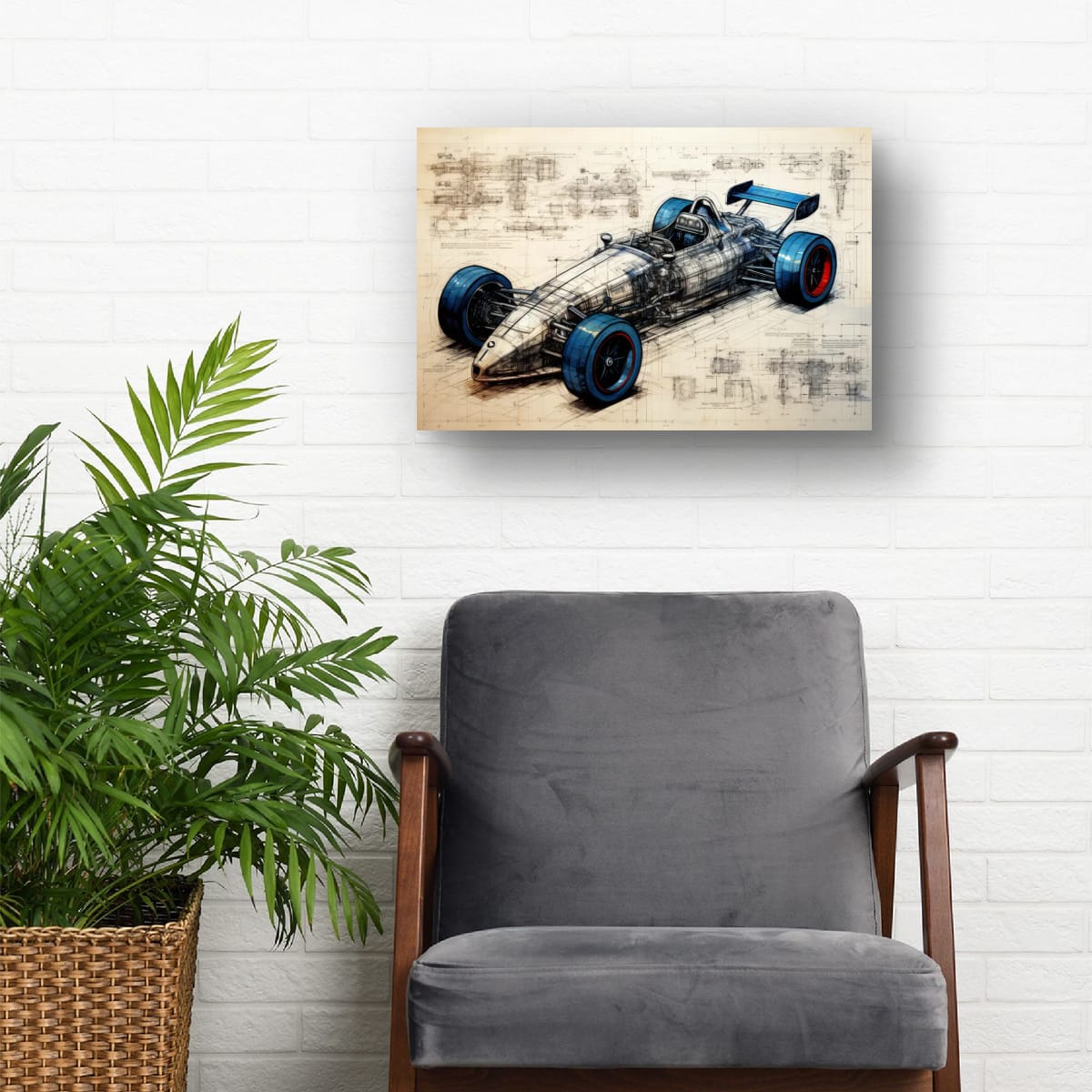 Designed for Speed presents a detailed vision of a racing car, blending technical precision with artistic design. The piece exhibits a striking balance between mechanical complexity and sleek form, highlighted by vivid blue and red accents on the tires. Intricate schematic lines and annotations weave through the composition, emphasizing the engineering behind the speed. This artwork makes a compelling addition for those drawn to innovation and motion within their space.