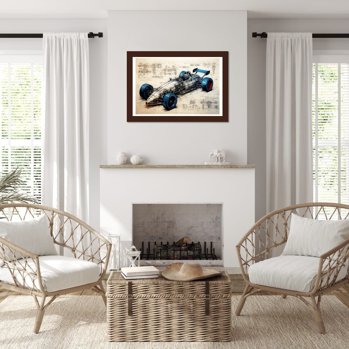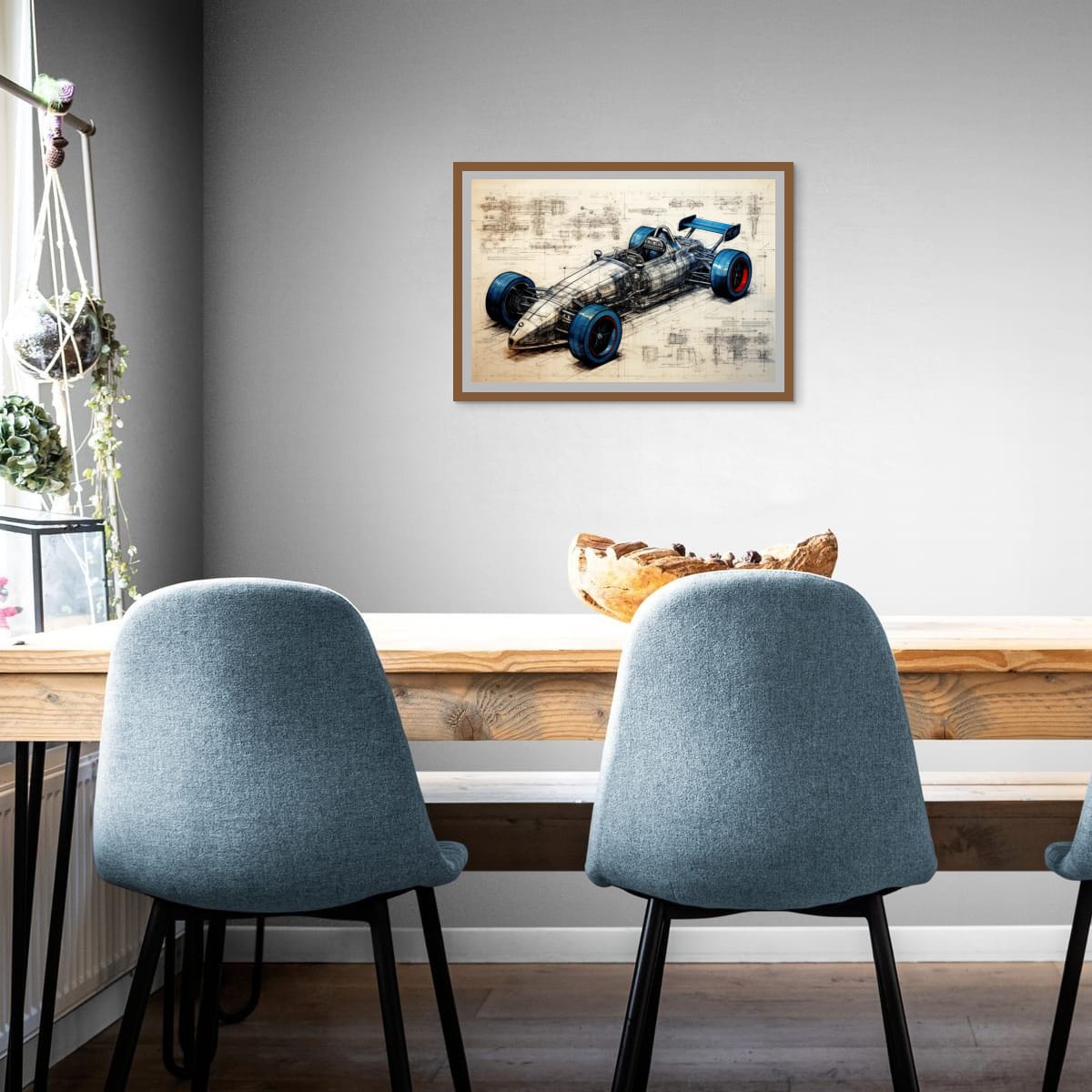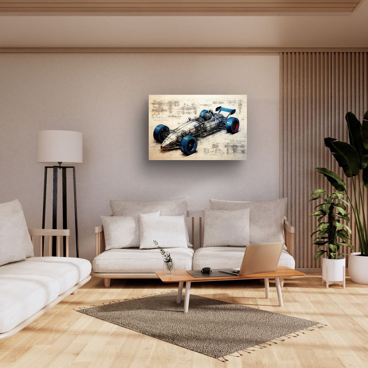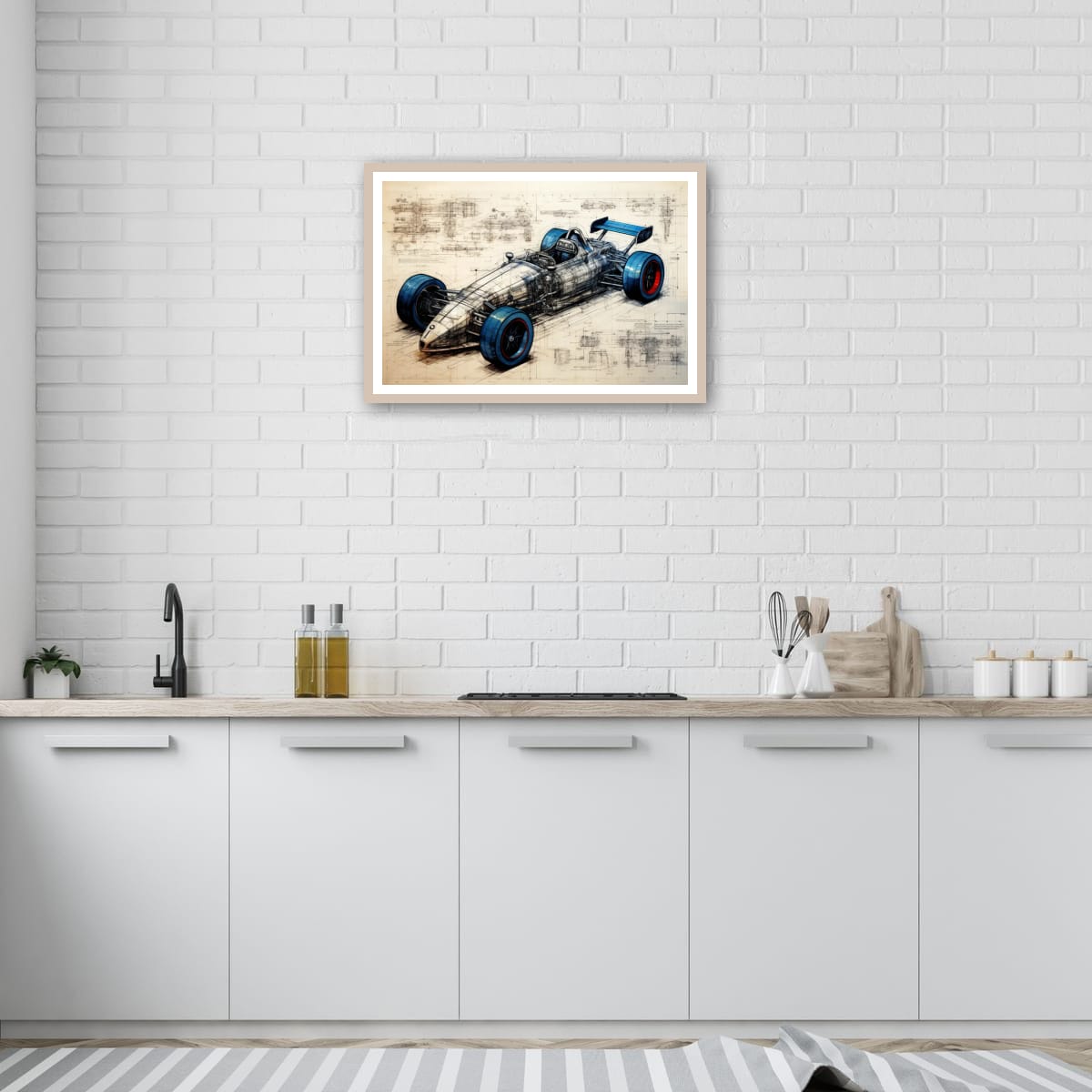 Designed for Speed presents a detailed vision of a racing car, blending technical precision with artistic design. The piece exhibits a striking balance between mechanical complexity and sleek form, highlighted by vivid blue and red accents on the tires. Intricate schematic lines and annotations weave through the composition, emphasizing the engineering behind the speed. This artwork makes a compelling addition for those drawn to innovation and motion within their space.
