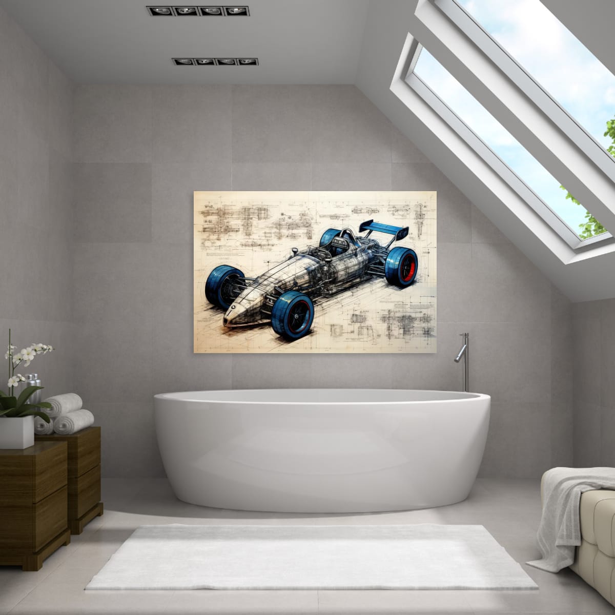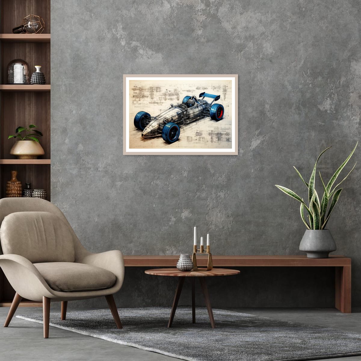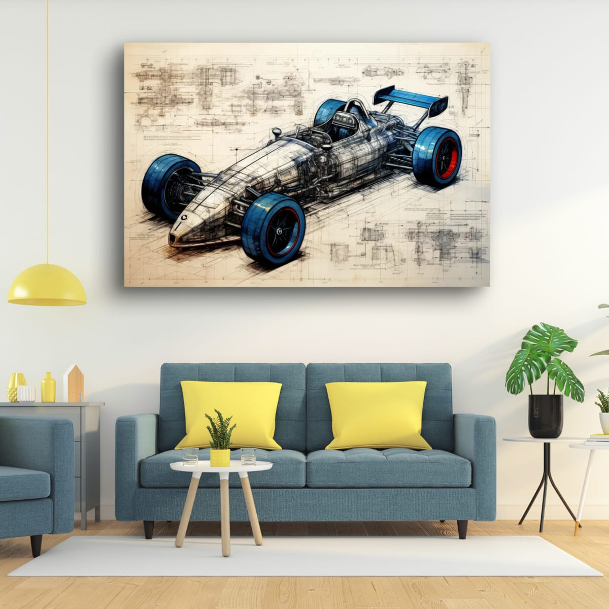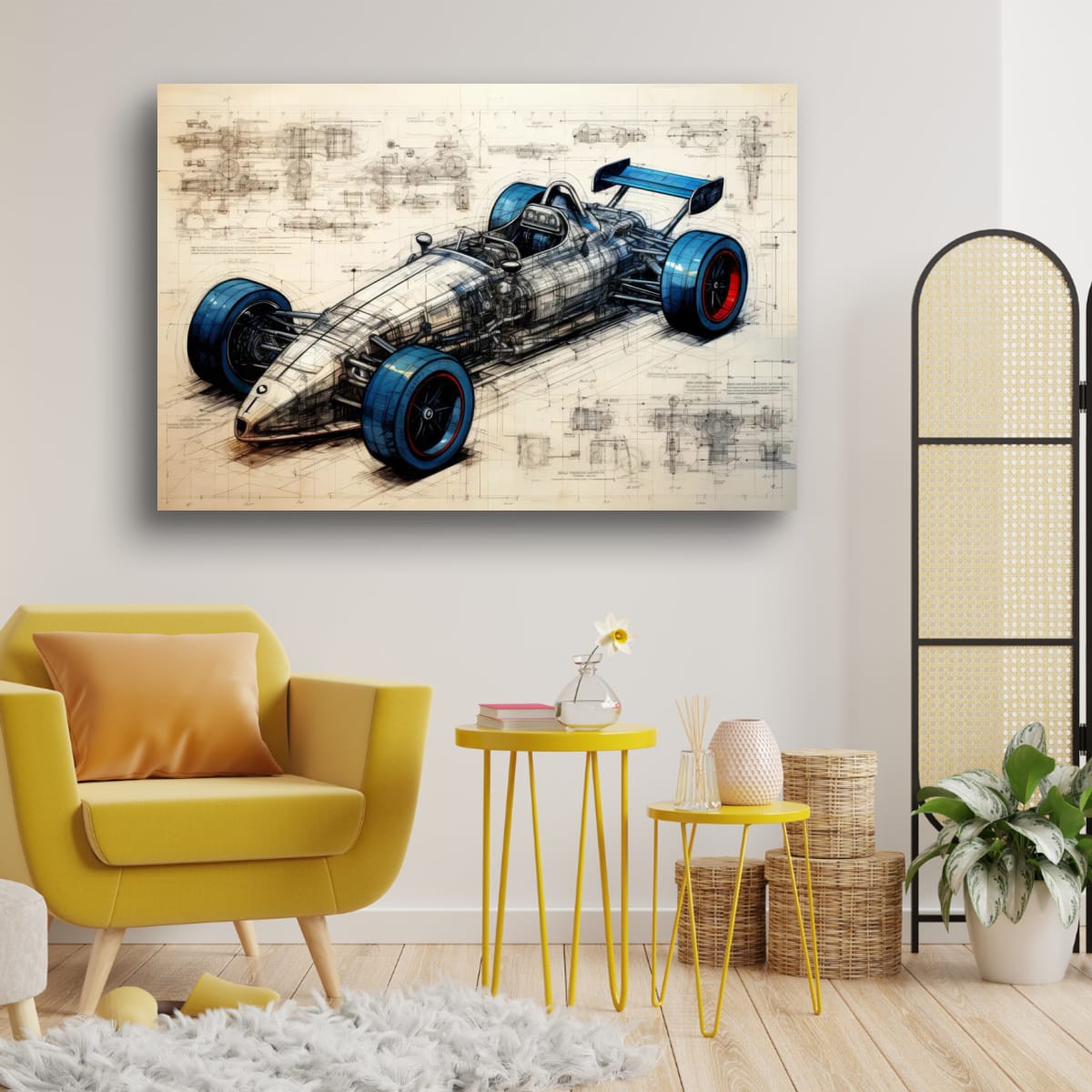 A single-seater racing machine presented as both artwork and technical study. Blueprint lines, exposed structure, and bold wheel accents blur the line between art and engineering.