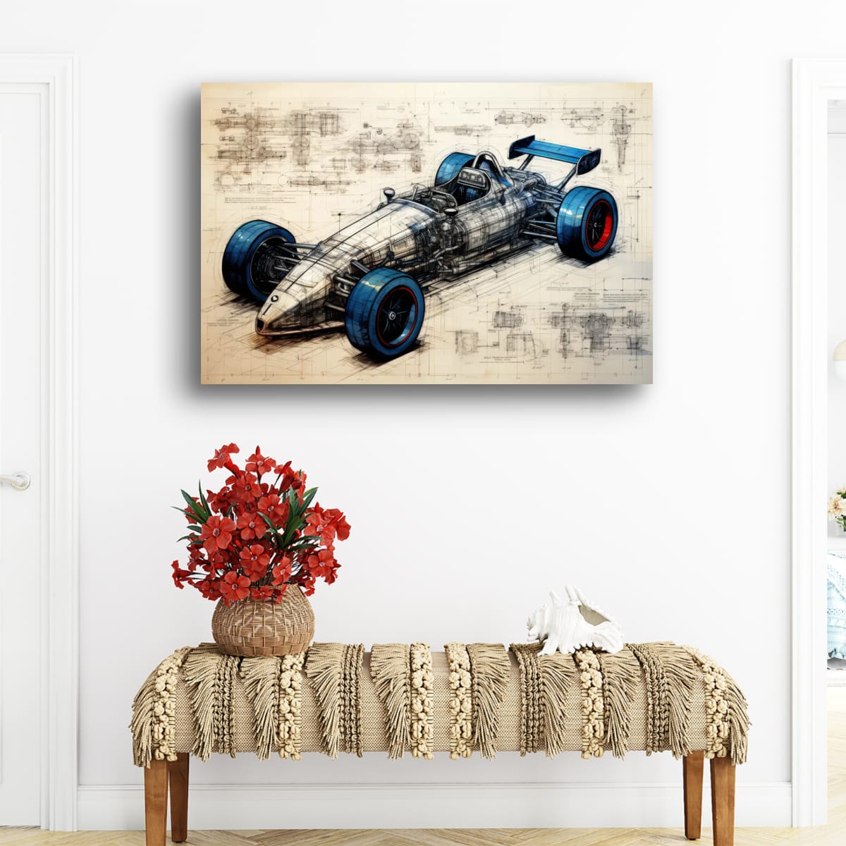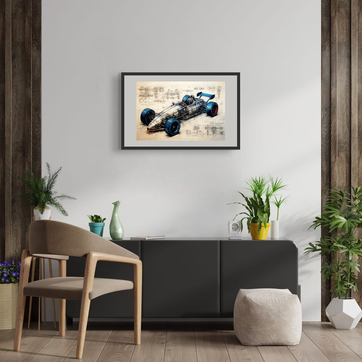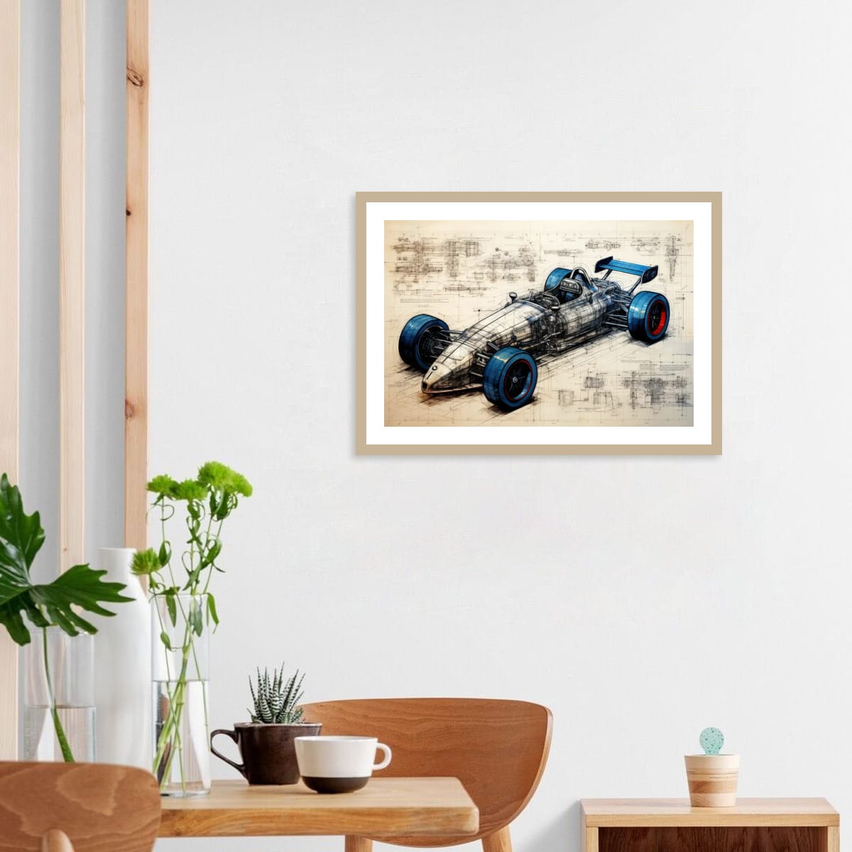 A single-seater racing machine presented as both artwork and technical study. Blueprint lines, exposed structure, and bold wheel accents blur the line between art and engineering.