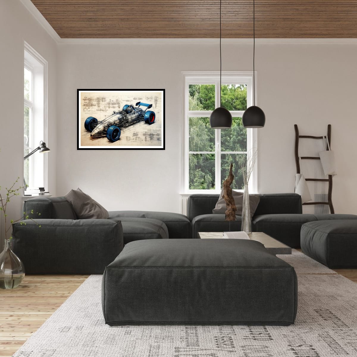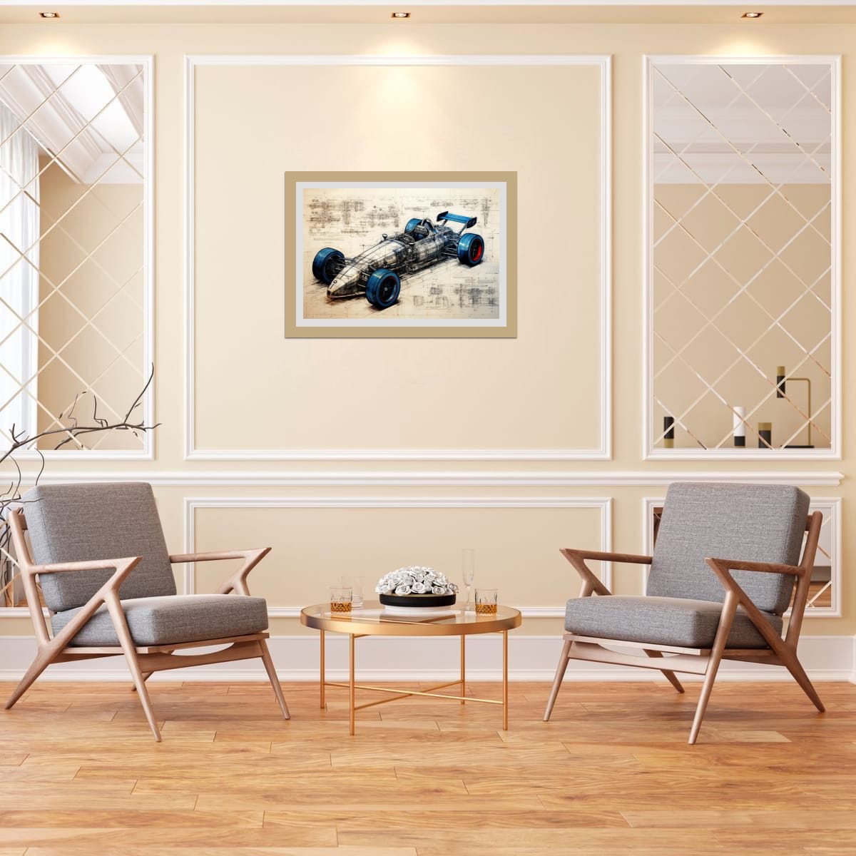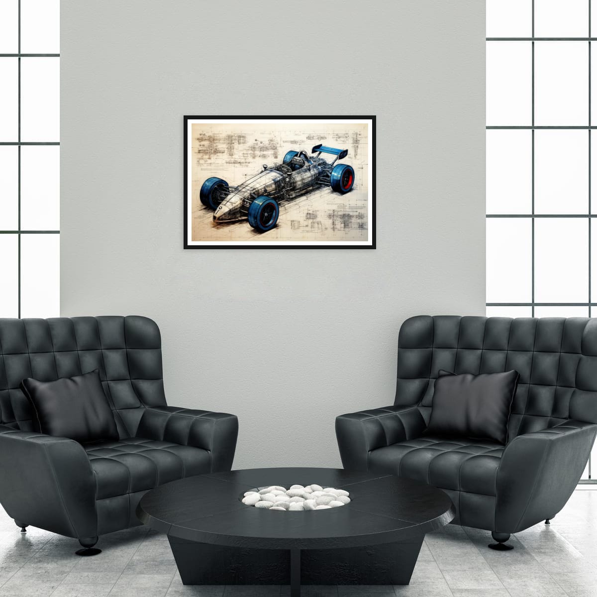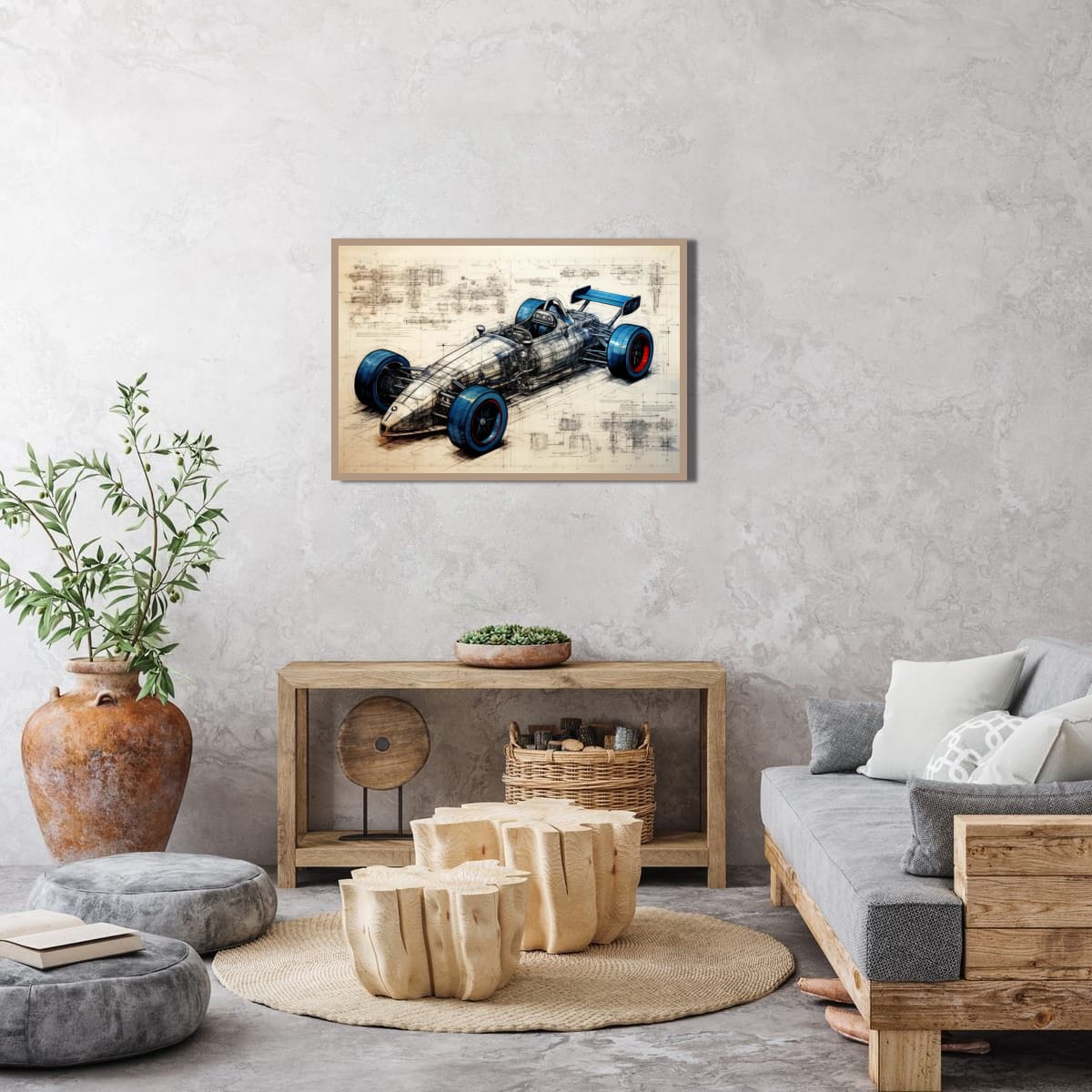 A single-seater racing machine presented as both artwork and technical study. Blueprint lines, exposed structure, and bold wheel accents blur the line between art and engineering.