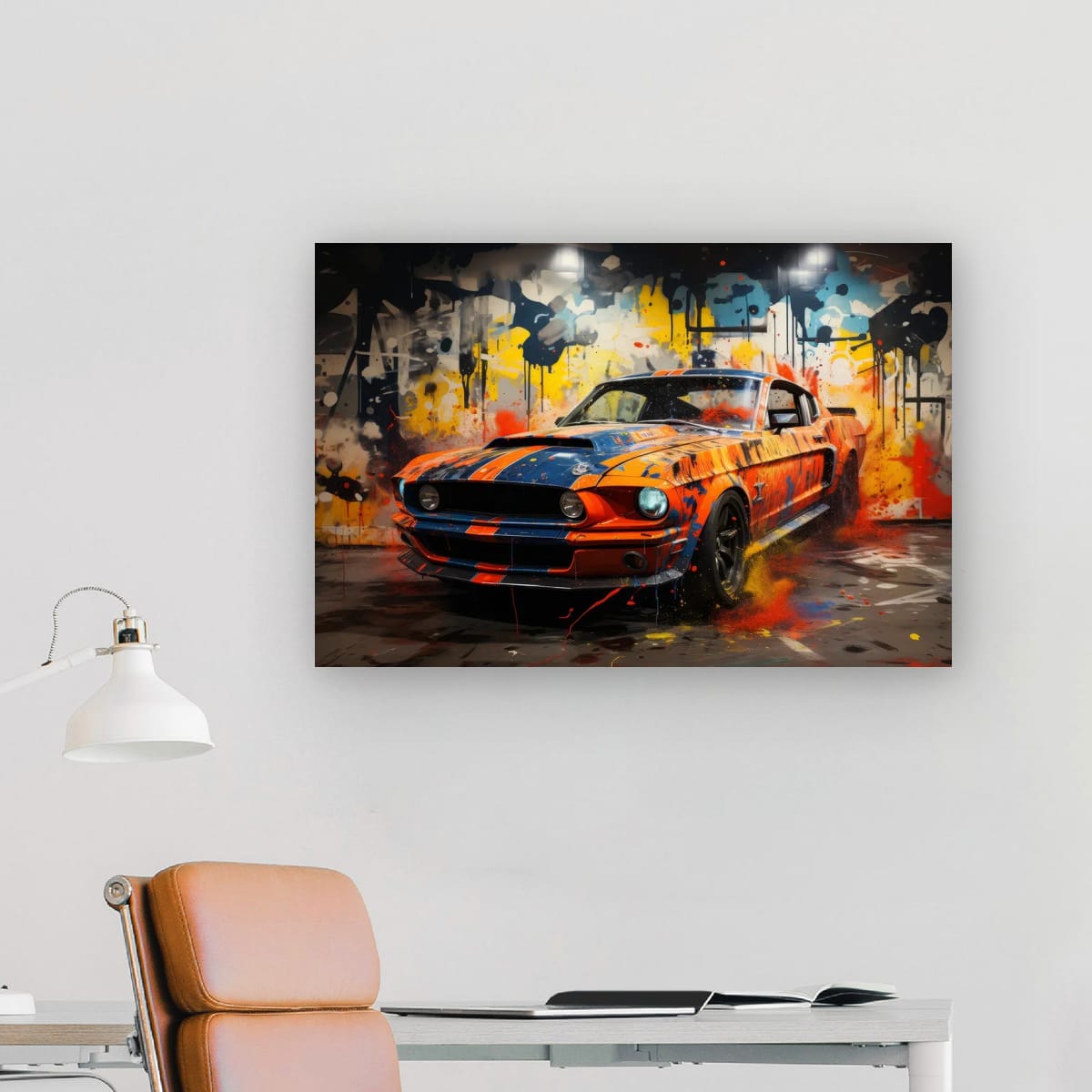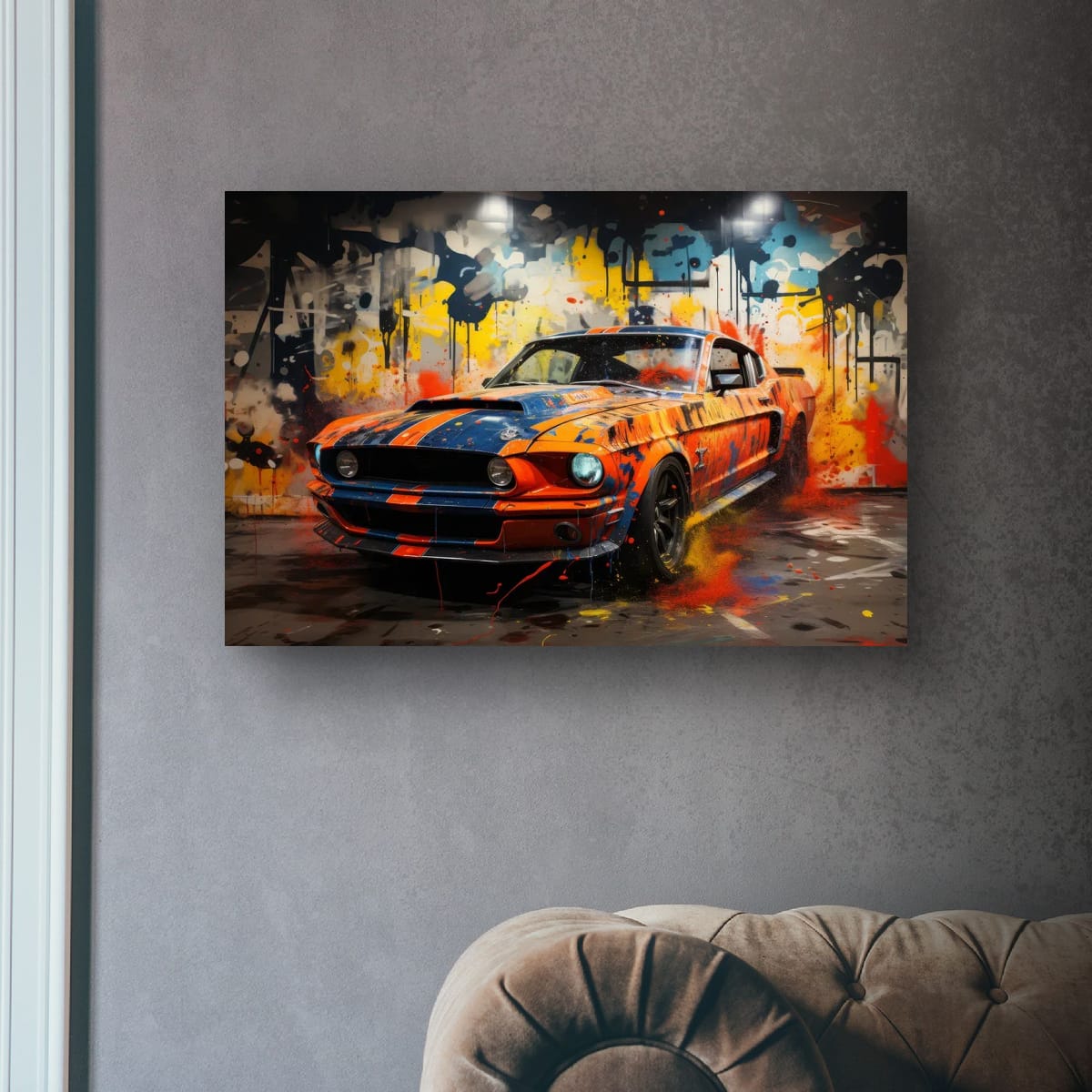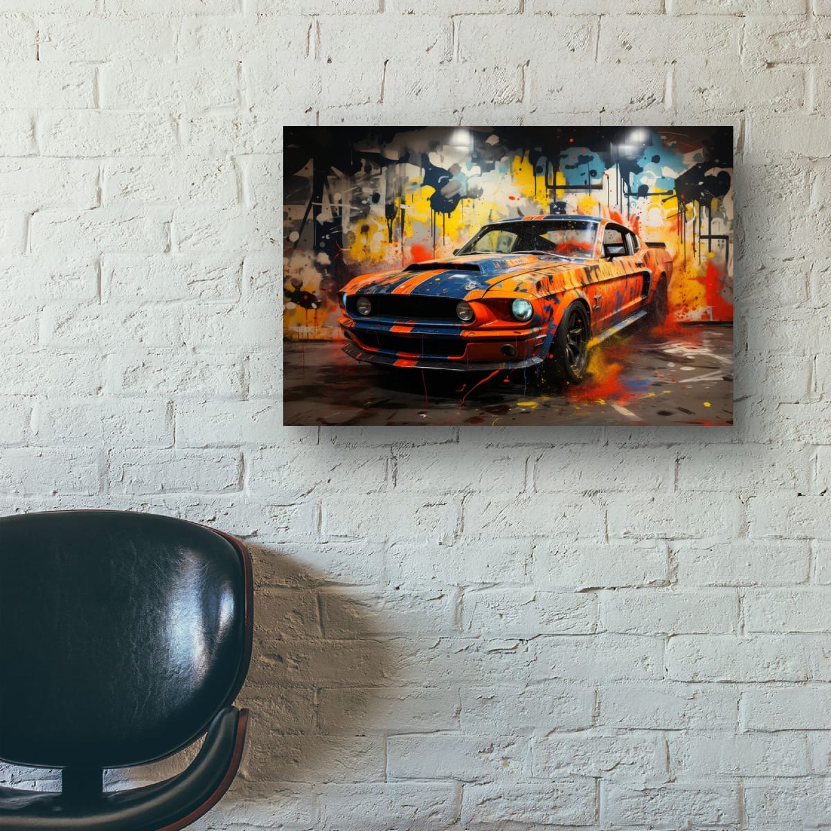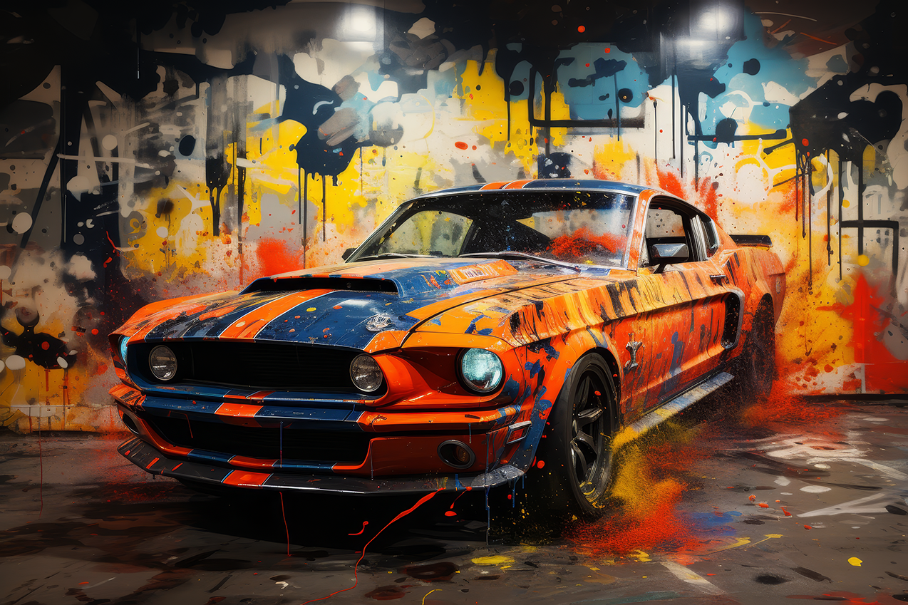 An American muscle icon explodes from the canvas in a riot of colour and motion. Thick paint splashes and aggressive lines amplify the raw energy of the machine, turning horsepower into pure visual noise.