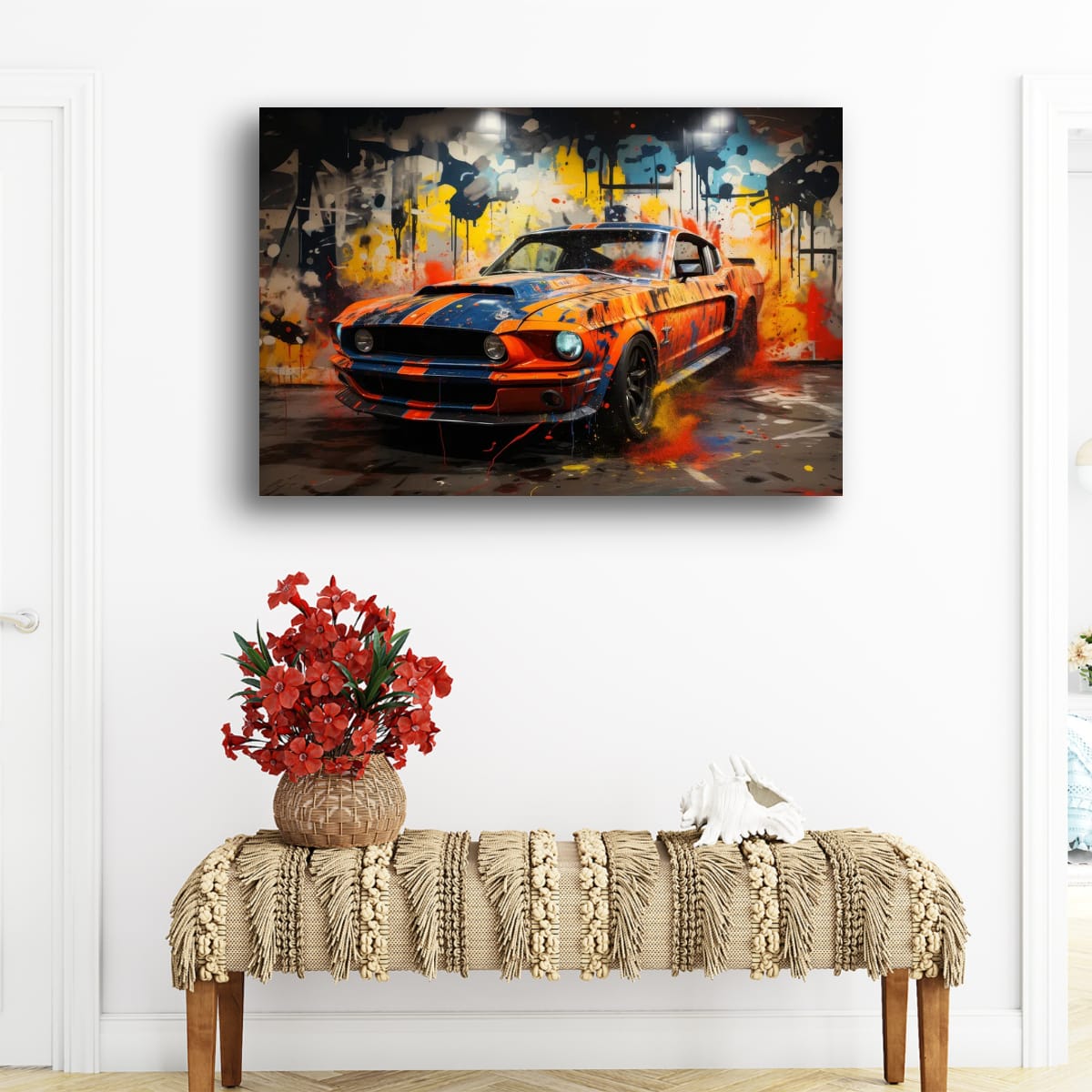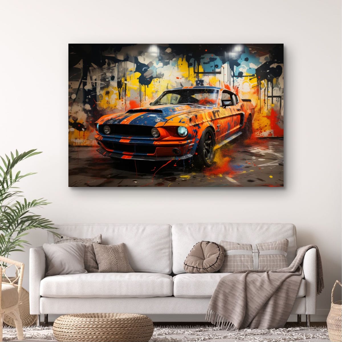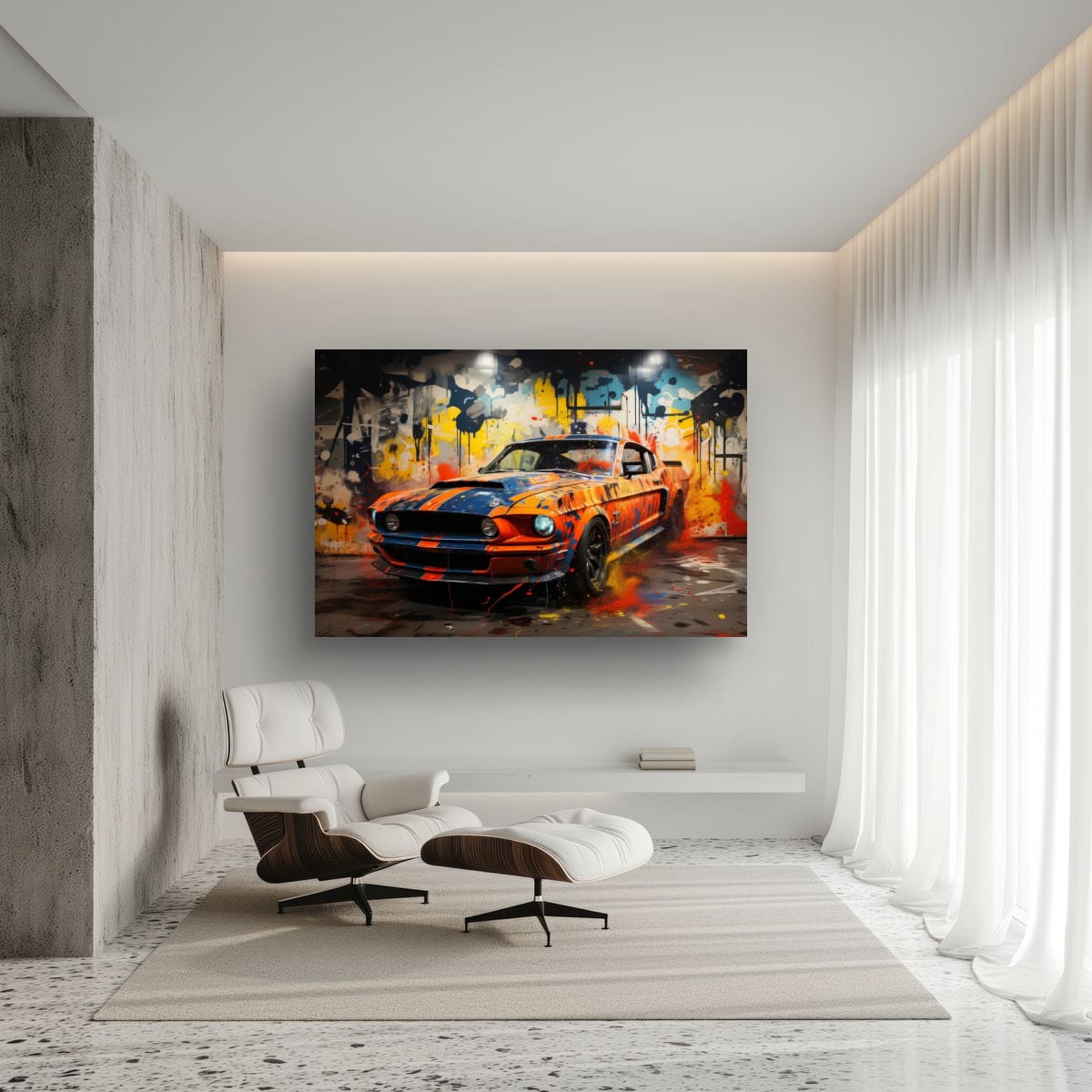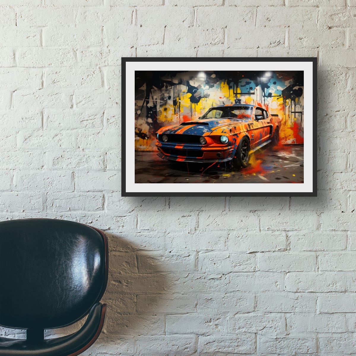 An American muscle icon explodes from the canvas in a riot of colour and motion. Thick paint splashes and aggressive lines amplify the raw energy of the machine, turning horsepower into pure visual noise.