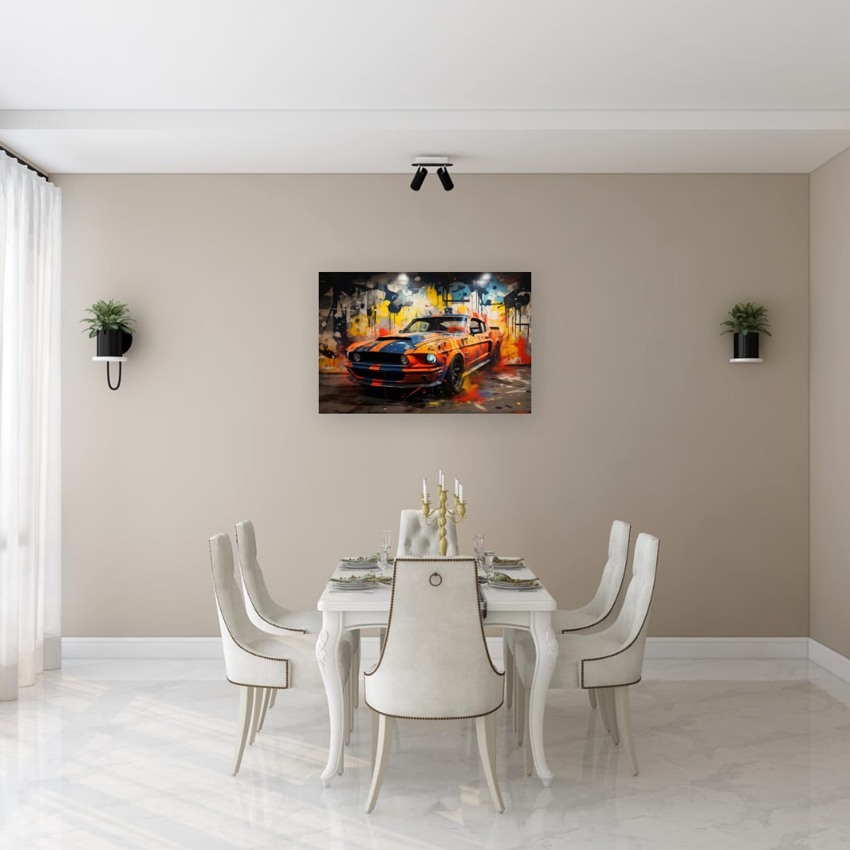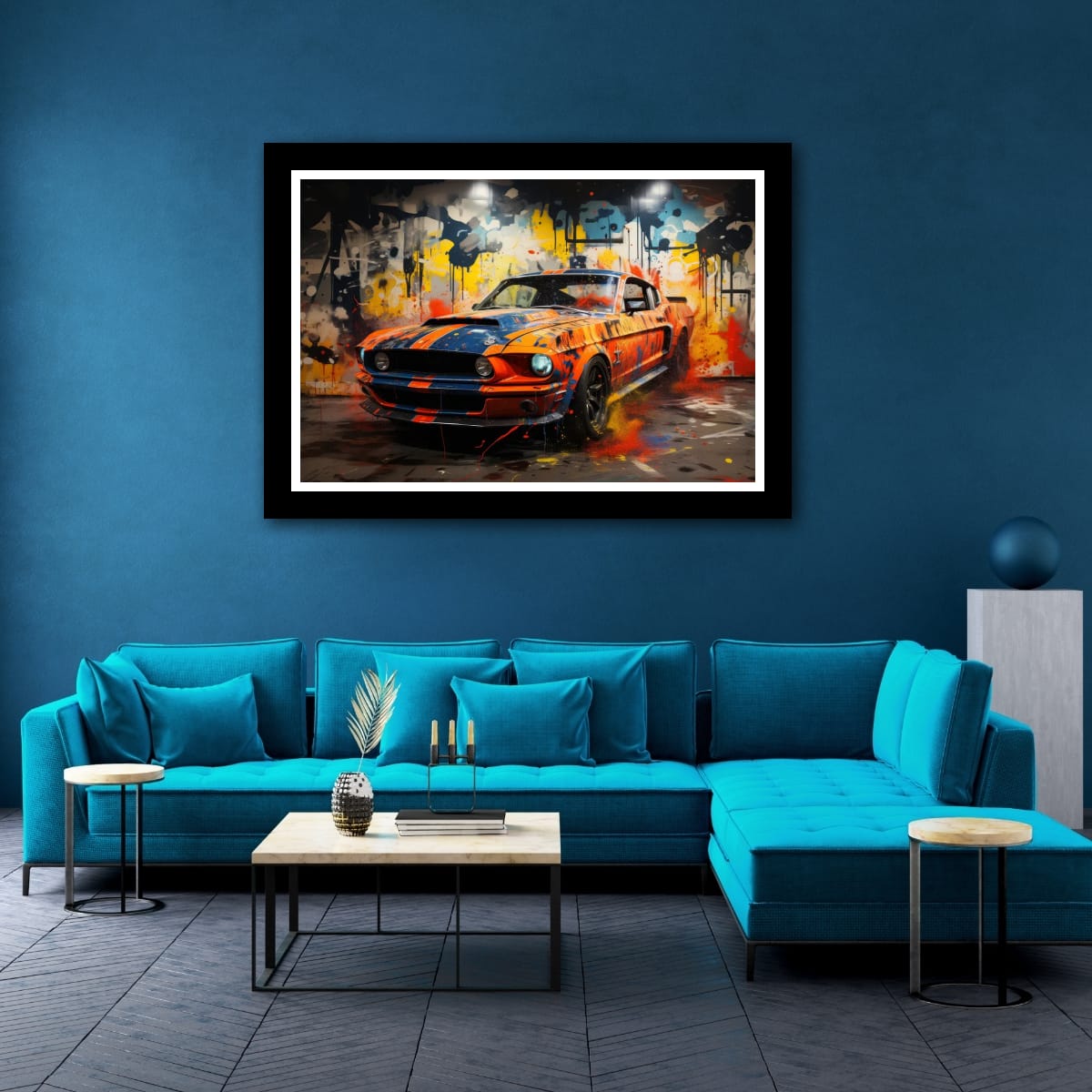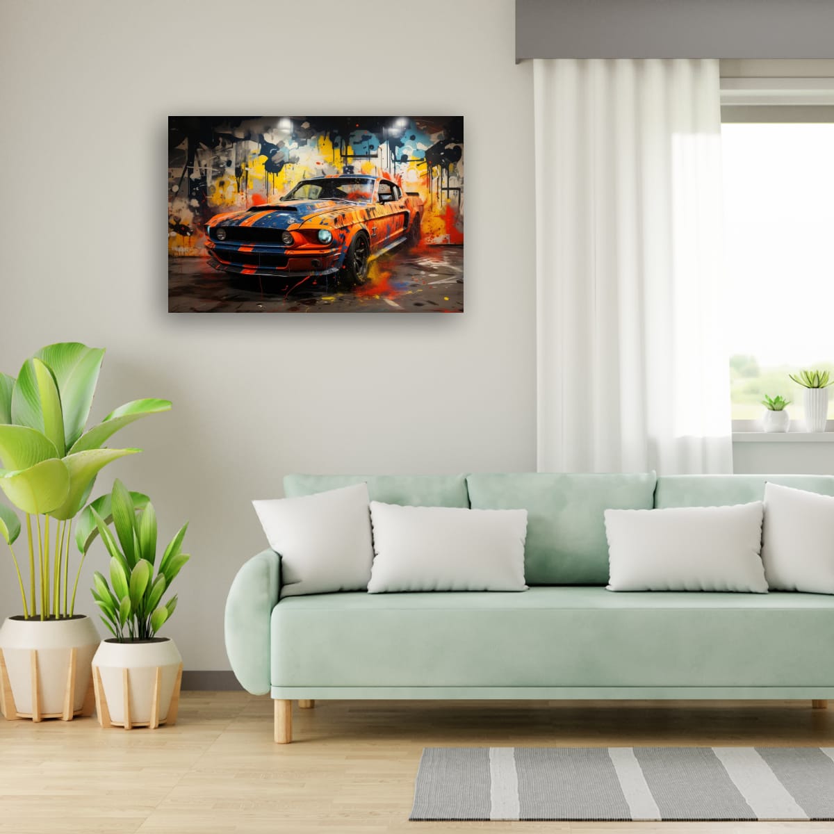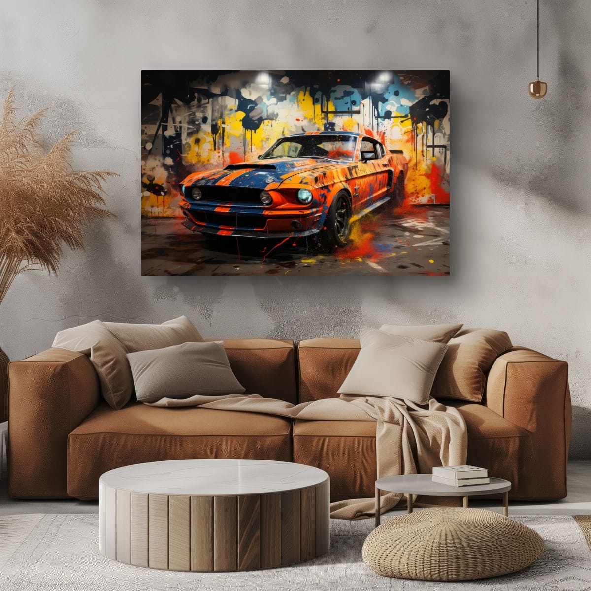 An American muscle icon explodes from the canvas in a riot of colour and motion. Thick paint splashes and aggressive lines amplify the raw energy of the machine, turning horsepower into pure visual noise.